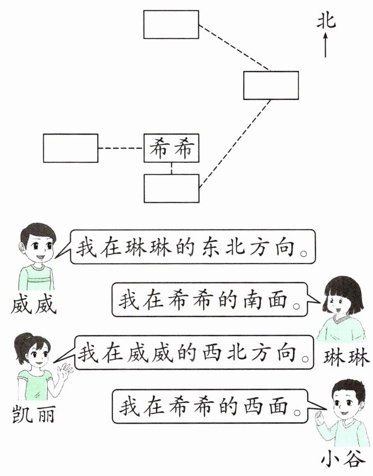 3. 先想一想,再在下图中标明每个人的位置,并填一填。