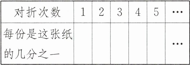 答案:5. $\frac{1}{2}$ $\frac{1}{4}$ $\frac{1}{8}$ $\frac{1}{16}$ $\frac{1}{32}$ 2 4 2 $\frac{1}{2}$ $\frac{1}{4}$ $\frac{1}{8}$ $\frac{1}{16}$ $\frac{1}{32}$ 越小 【提示】通过动手操作理解每次对折后,纸张被平均分成的份数与每份占这张纸的几分之一的变化规律。