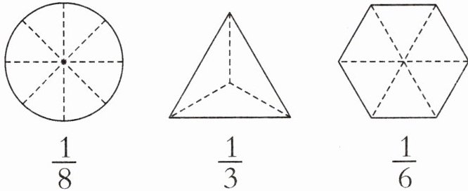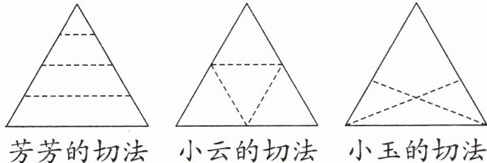 答案:3. 小云 $\frac{1}{4}$ $\frac{1}{4}$ 【提示】芳芳的切法是把蛋糕横向分层切割,没有平均分成 4 份;小云的切法将蛋糕分成了 4 个完全相等的小三角形,分成的 4 份一样多;小玉的切法没有将蛋糕平均分成 4 份。因此小云的切法最合理。因为按小云的切法蛋糕被平均分成了 4 份,所以其中的一份就是 $\frac{1}{4}$ 块蛋糕,也就是这块蛋糕的 $\frac{1}{4}$。
