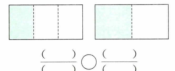 答案:2. $\frac{1}{3} < \frac{1}{2}$ 【提示】第一个长方形被平均分成 3 份,涂色部分是 1 份,用分数表示为 $\frac{1}{3}$;第二个长方形被平均分成 2 份,涂色部分是 1 份,用分数表示为 $\frac{1}{2}$。把同样大小的图形平均分,分的份数越多,每份就越小,因此 $\frac{1}{3} < \frac{1}{2}$。