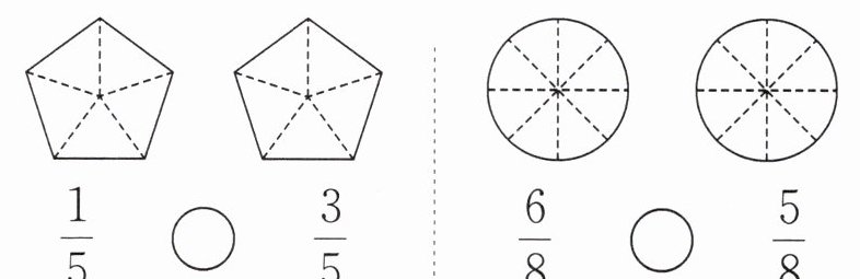 [提示]第一组图中,将图形都平均分成5份,1份比3份少,因此1个$\frac{1}{5}$比3个$\frac{1}{5}$小,即$\frac{1}{5}<\frac{3}{5}$;第二组图中,将图形都平均分成8份,6份比5份多,因此6个$\frac{1}{8}$比5个$\frac{1}{8}$大,即$\frac{6}{8}>\frac{5}{8}$。