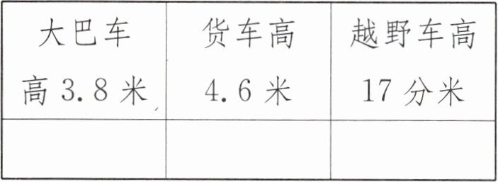 答案:5. 大巴车 越野车 【提示】4.5 米 = 45 分米,3.8 米 = 38 分米,4.6 米 = 46 分米,38 分米 < 45 分米,46 分米 > 45 分米,17 分米 < 45 分米,因此大巴车和越野车都能通过大桥,货车不能通过大桥。