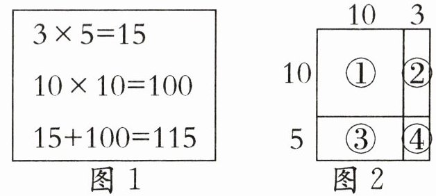 1. 在计算13×15时,赵芳的方法如图1所示,这样计算出的结果与正确结果不一致。请你结合图2进行分析,赵芳出错的原因是没有加上图2中的(