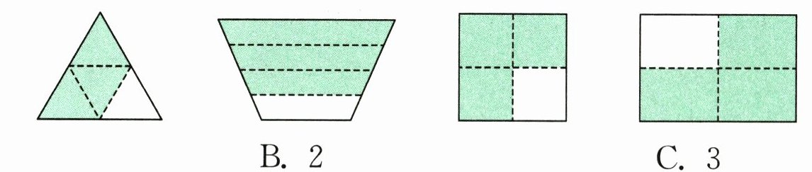 1. 下面图形中,涂色部分能用分数$\dfrac{3}{4}$表示的有(