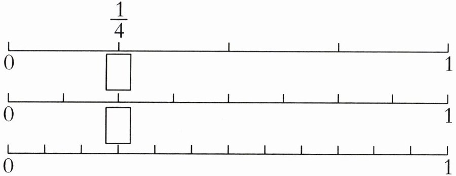 8. 在下图中先填上与$\dfrac{1}{4}$相等的分数,再找出另一组相等的分数,写在图中对应的位置上。