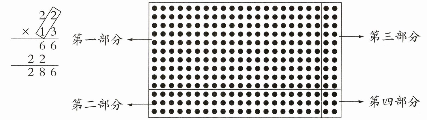1. 某店铺的钥匙扣每个22元,安安买了13个,一共花了多少元?如左下图竖式中框出部分的计算结果对应的是点子图中的第(