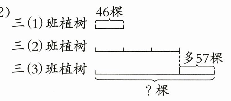 [提示]根据题意可知,舞蹈组的人数是美术组的3倍,先求舞蹈组的人数,再加上美术组的人数即可;三(2)班植树的棵数是三(1)班的3倍,先求三(2)班植树的棵数,再加上57就是三(3)班植树的棵数。