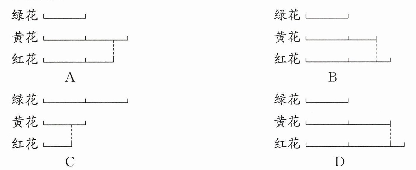 3. 绿花有15朵,黄花的朵数是绿花的2倍,红花比黄花少5朵。下列线段图符合题意的是(
