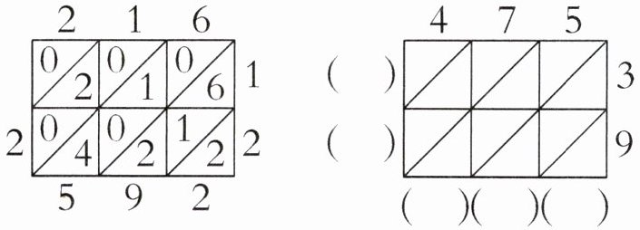 【提示】将横、纵数位数字相乘的积写在相应的格子里,两位数乘积按规则分别写在格子的不同位置。斜线相加,从方格右下角起,沿斜线将格子内数字相加,有进位的要处理好。得出结果把各斜线相加所得数字按从上到下、从左到右的顺序排列,就是最终乘法运算的结果。
