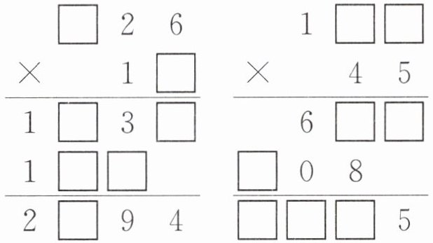 [提示]第一个竖式:由积的个位是4可知,三位数乘两位数的个位得到的积的个位是4,两位数的个位可以是4或9,而$26×4 = 104$,$26×9 = 234$,因此,这个两位数的个位是9;由三位数乘两位数的十位得到的积的最高位是1可知,这个三位数的百位是1,综上,该竖式计算的是$126×19$。第二个竖式:由三位数乘两位数的十位得到的积的末位是8可知,这个三位数的个位可以是2或7,而$2×5 = 10$,不符合题意,因此这个三位数的个位是7;$127×5 = 635$,$137×5 = 685$,这个三位数的十位可以是2或3,而$127×4 = 508$,符合题意,$137×4 = 548$,不符合题意,因此这个三位数的十位是2,综上,该竖式计算的是$127×45$。
