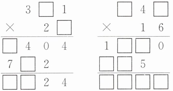 [提示]第一个竖式:因为只有$4×1 = 4$,所以两位数的个位是4;要使三位数乘两位数个位的积的十位是0且要向前一位进2,这个三位数的十位只能是5,综上,该竖式计算的是$351×24$。第二个竖式:因为只有$5×6 = 30$,所以这个三位数的个位是5,而$145×6 = 870$,$245×6 = 1470$,$345×6 = 2070$,因此这个三位数是245。