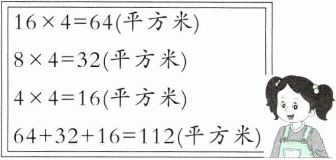 $\begin{array} { l } { 1 6 × 4 = 6 4 ( \mathrm{ 平 方 米 } ) } \\ { 8 × 4 = 3 2 ( \mathrm{ 平 方 米 } ) } \\ { 4 × 4 = 1 6 ( \mathrm{ 平 方 米 } ) } \\ { 6 4 + 3 2 + 1 6 = 1 1 2 ( \mathrm{ 平 方 米 } ) } \end{array}$