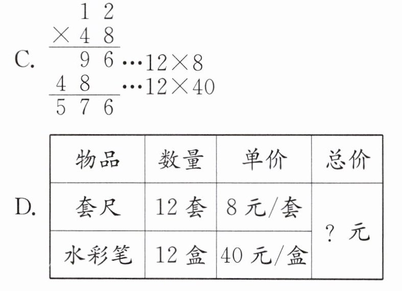 3. 新考法 算理探究 下面不能说明“$12× (40+8)=12× 40+12× 8$”的是(