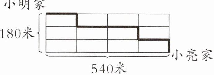 5. (南通如皋市)下图是小明家和小亮家所在小区的平面图。小明沿着图中的黑色粗线道路走到小亮家,前 $ 3 $ 分钟走了 $ 240 $ 米。照这样的速度,他从家走到小亮家一共需要多少分钟?