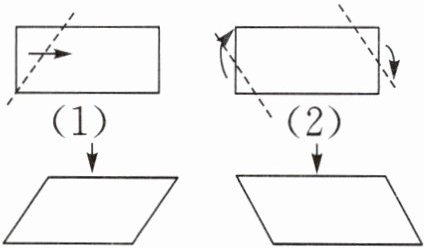 5. 将长方形沿虚线剪开,将图(1)剪下的部分平移,图(2)剪下的部分旋转后,得到下面相对应的图形。比较得到的平行四边形的底和高与原长方形的长和宽,它们有什么关系?