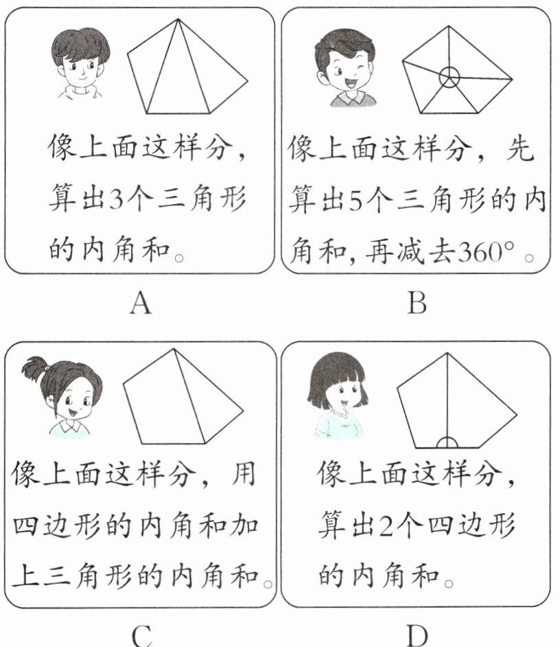 答案:2. D 【提示】D选项中算出2个四边形的内角和再减去多算的180°才能推算出五边形的内角和。