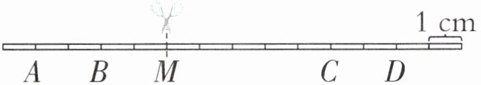 1. (常州溧阳市·推理意识)将一根长14厘米的小棒剪2刀,用得到的三根小棒首尾相接围一个三角形。若第一刀剪在M处,如下图所示,第二刀剪在(