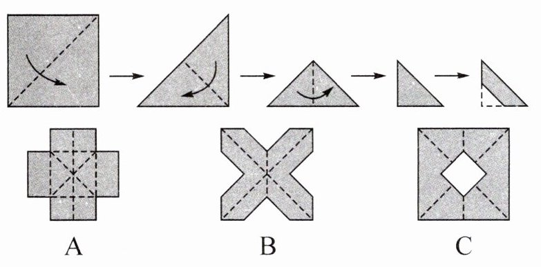 探究把一个图形折叠并剪掉一部分后展开的图案时,可以根据图形折叠的过程逆推,从而得出答案,也可以按要求动手折一折、剪一剪。