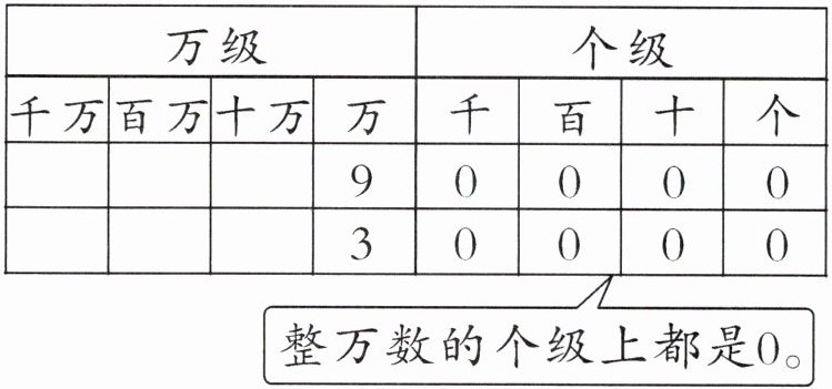 【提示】(1)读整万数时,先从末尾数出 4 个“0”,4 个“0”的前面是多少就读多少,再在后面加一个“万”字。(2)根据数位顺序表,从右往左依次是个位、十位、百位、千位、万位、十万位、百万位……不同数位上的数字表示的计数单位不同,9010000 中 9 在百万位上,所以表示 9 个百万;4980000 中 9 在十万位上,所以表示 9 个十万。