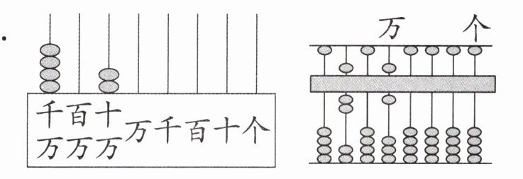 【提示】在算盘中,一颗上珠表示 5,一颗下珠表示 1。读整万数时,先从末尾数出 4 个“0”,4 个“0”前面是多少就读多少,再在后面加一个“万”字。