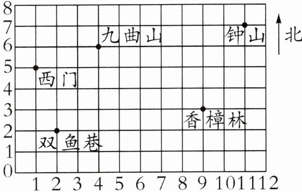 (2)请在图上标出枫叶林(7,7)、咏荷池(11,1)和白塔(1,7)的位置。