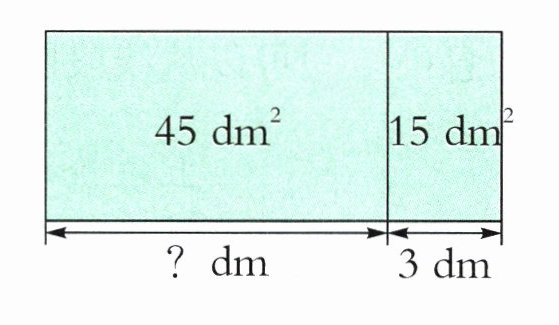 $45÷(15÷3) = 9$ (分米) 【提示】已知右侧小长方形的面积和宽,可以求出右侧小长方形的长为 $15÷3 = 5$ (分米),即左侧长方形的宽为 5 分米,据此求出左侧长方形的长为 $45÷5 = 9$ (分米)。