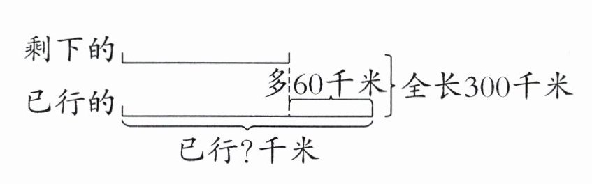 答案:3. $(300 + 60)÷2 = 180$ (千米) 【提示】观察线段图可知,已行的路程的 2 倍 = 全长 300 千米 + 60 千米,据此求出已行的路程为 $(300 + 60)÷2 = 180$ (千米)。