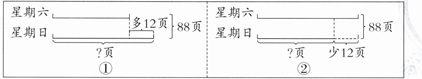 (2) $(88 + 12)÷2 = 50$ (页) 【提示】先把星期日多读的 12 页加上,此时两天读的页数一样多,总数就变为 $88 + 12 = 100$ (页),这 100 页是星期日读的页数的 2 倍,所以星期日读的页数是 $100÷2 = 50$ (页)。
