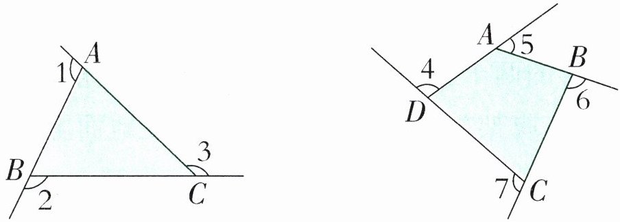 5. 同学们,你们认识多边形的外角吗?多边形的边与它的邻边延长线所形成的夹角就是它的外角。如下图,$∠ 1$、$∠ 2$、$∠ 3$就是三角形的三个外角,$∠ 4$、$∠ 5$、$∠ 6$、$∠ 7$就是四边形的四个外角。