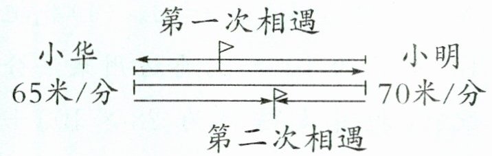 小华和小明分别从一座桥的两端同时出发,往返于桥的两端之间。小华的速度是 $65$ 米/分,小明的速度是 $70$ 米/分,经过 $5$ 分钟两人第二次相遇。这座桥长多少米?