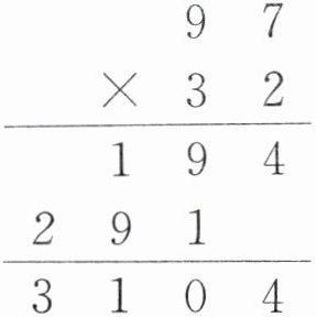 第一个竖式中,根据第一个乘数的个位与2相乘的积的个位是4,可知第一个乘数的个位是2或7,再根据第二个积的末尾是1,可知第一个乘数的末尾只能为7,且第二个乘数为32。根据两个中间积与最终积的关系,可知4的前面必为9,则第一个乘数为97,由此填写。