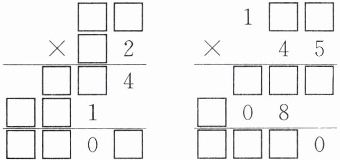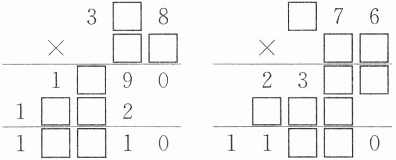 【提示】根据已知数据和乘法算式的特点,从乘得的数字和积的位数出发填上合适的数字即可。