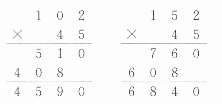 第二个竖式中,根据第一个乘数的个位乘5得0,乘4得8,可知第一个乘数必为$1□2$,根据$1□2×4$的积的十位是0,可知,第一个乘数为102或152,经尝试,两种情况均可填写出符合题意的竖式。