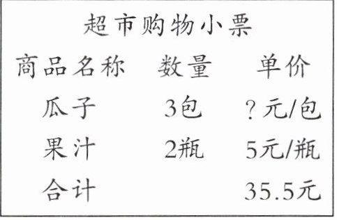 【提示】根据购物小票信息可知购买的瓜子数量和果汁单价、数量及总金额,根据“果汁的总价+瓜子的总价=总金额”列方程求出瓜子的单价。