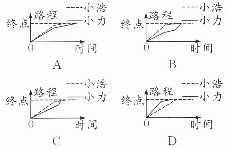4. 实验班原创 模型意识 小浩和小力参加自行车骑行比赛。开赛之后,小浩一路领先,小力也不甘示弱,紧随其后。但在距离终点 300 米处时,小浩的自行车意外爆胎,情急之下小浩推着自行车继续参赛。在观众都为他惋惜时,小力却放慢骑行速度,放弃超越小浩,最终两人先后到达终点。下面符合两人比赛情况的是(