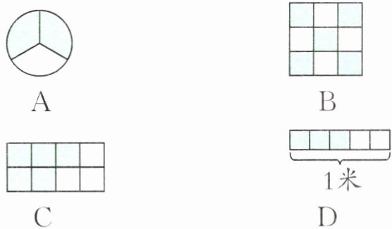 答案:3. (1)A 【提示】根据题图可知,整体平均分成3份,涂色部分占2份,涂色部分表示的分数为$\frac{2}{3}$。选项 A 中涂色部分表示$\frac{2}{3}$,选项 B 中涂色部分表示$\frac{5}{9}$,选项 C 中涂色部分表示$\frac{5}{8}$,选项 D 中涂色部分表示$\frac{3}{5}$,故选 A。