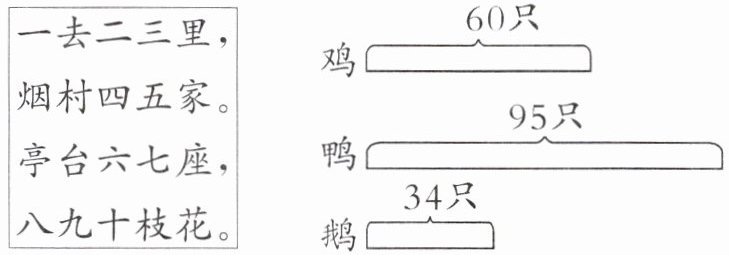 (2) 右上图中鸡的只数是鸭的$\frac{( )}{( )}$,鹅的只数是鸡的$\frac{( )}{( )}$,鸭的只数相当于鹅的$\frac{( )}{( )}$,鸡的只数相当于鹅的$\frac{( )}{( )}$。