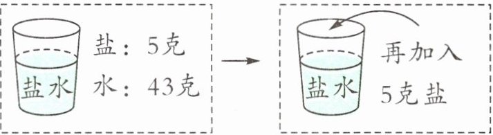 答案:(3)$\frac{5}{48}$ $\frac{10}{53}$【提示】原来有盐水$5+43=48$(克),盐占盐水的$5÷48=\frac{5}{48}$;加入5克盐后,盐和盐水都增加了5克,盐占盐水的$(5+5)÷(5+48)=\frac{10}{53}$。