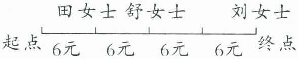 舒女士、刘女士3人共同承担,从$\frac{1}{4}$处到$\frac{1}{2}$处花了6元,应由舒女士和刘女士2人共同承担,从$\frac{1}{2}$处到终点花了12元,应由刘女士1人承担。