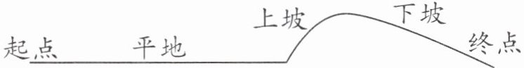 6. 李叔叔是一个注重养生的人,也是自行车运动爱好者,双休日经常去骑行。这一次骑行的线路如右下图所示。骑行的第一段是平地,占全程的$\frac{1}{2}$;当李叔叔骑完第二段(上坡路)时,一共骑行了全程的$\frac{2}{3}$;最后一段是下坡路。
