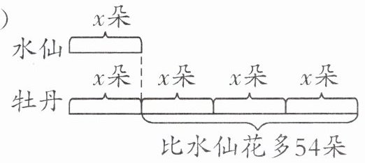 (2) $ 4x - x = 54 $ $ x = 18 $ 【提示】根据“牡丹的朵数-水仙的朵数=54”列方程解答即可。