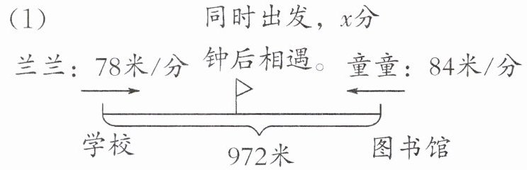 答案:3. (1) $ (78 + 84)x = 972 $ $ x = 6 $ 【提示】根据“兰兰和童童的速度和×相遇时间=学校到图书馆的距离”列方程解答即可。