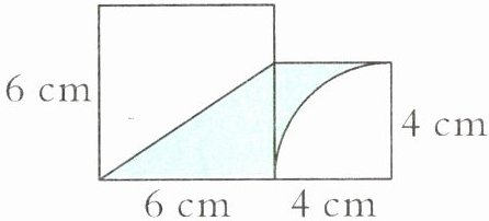 【提示】将涂色部分分为两部分,一部分是大正方形中的涂色部分,面积为 6×4÷2 = 12(cm²),一部分是小正方形中的涂色部分,面积为 4² - 3.14×4²÷4 = 3.44(cm²)。最后将两部分相加即可。