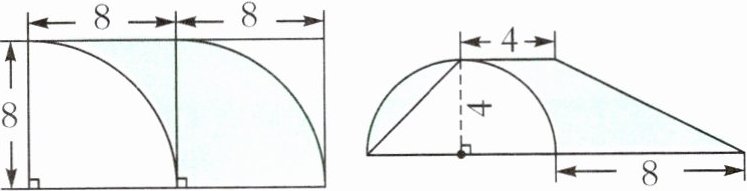[提示]左图中将右边正方形中的半圆涂色部分平移至左边正方形的空白部分,涂色部分组成一个边长为8厘米的正方形,据此求面积即可;右图中,通过折叠,把左边的涂色部分折叠到右边,使涂色部分组成一个梯形。