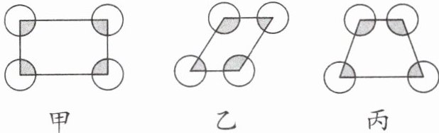 (2) 如下图,分别以长方形、平行四边形、梯形的四个顶点为圆心,画半径为1厘米的圆。下面各图中的涂色部分的面积相比,(