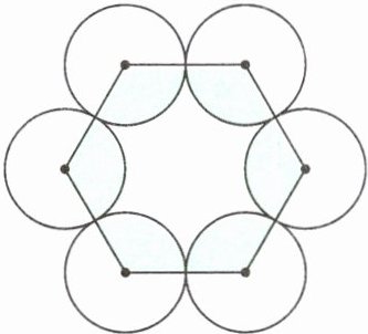 6. (镇江句容市)右下图中六个相同的圆的圆心连线构成一个边长为 10 厘米的正六边形。求正六边形内涂色部分的面积。