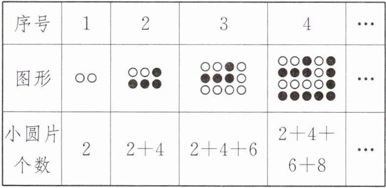 【提示】(1)通过观察图形 1~4 可知,当序号为 1 时,小圆片个数为 $ (1 × 2) $,序号为 2 时,小圆片个数为 $ (2 × 3) $,序号为 3 时,小圆片个数为 $ (3 × 4) $……也就是小圆片个数=序号×(序号+1);(2)按照(1)得出的规律,序号为 $ n $ 的图形中小圆片个数为 $ n × (n + 1) $,因为 $ 156 = 12 × 13 $,所以序号为 12 的图形有 156 个小圆片。
