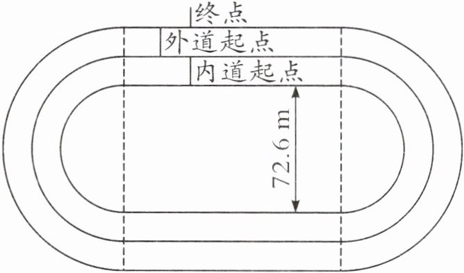 (5)在400米赛跑中,由于有弯道(如下图),为了公平,外道和内道选手的起跑线不在同一地点。每条跑道宽1.25米,外道选手的起点比内道选手前移(