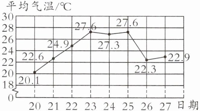 【提示】(1)由统计图直接读出数据,填空即可。(2)$(22.6+24.9+27.6+27.3+27.6)÷5=26(^{\circ}C)$。