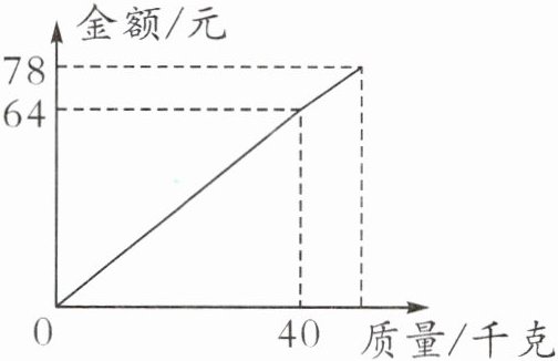 答案:2. 38 【提示】由图可知,没有降价前 40 千克西瓜卖了 64 元,每千克售价为$64÷40=1.6$(元),降价 0.2 元后每千克售价变为$1.6-0.2=1.4$(元),金额变成了 78 元,说明降价后卖了$78-64=14$(元),那么降价后卖了$14÷1.4=10$(千克)。总质量将变为$40+10=50$(千克)。刘叔叔的成本为$50×0.8=40$(元),赚了$78-40=38$(元)。